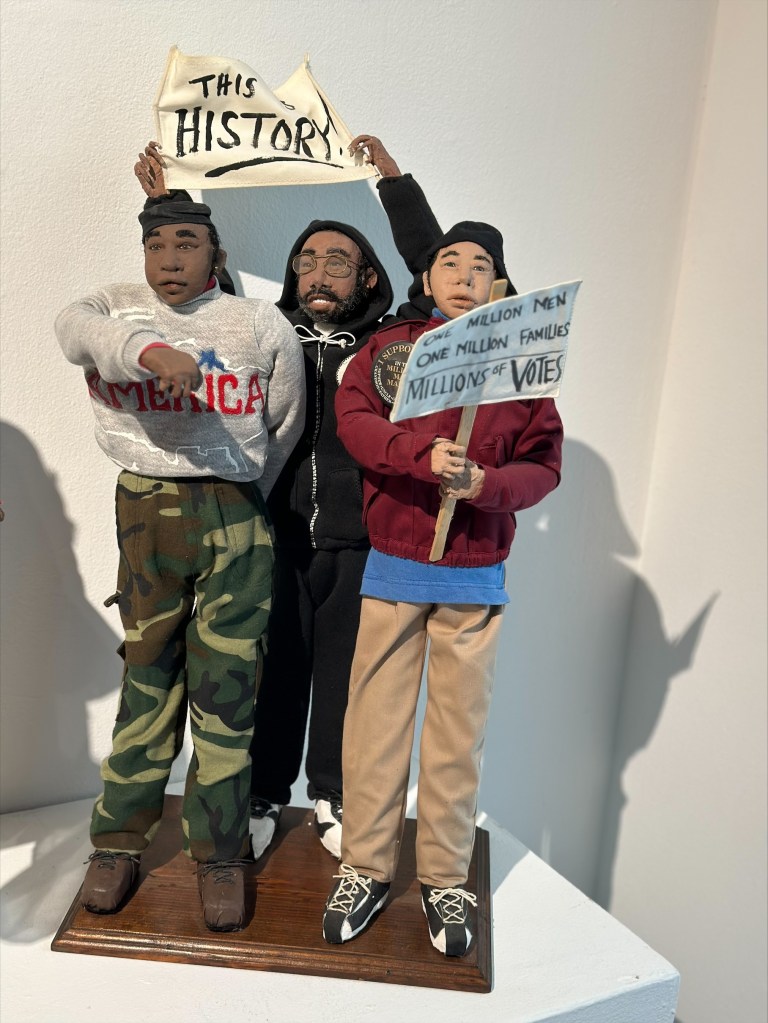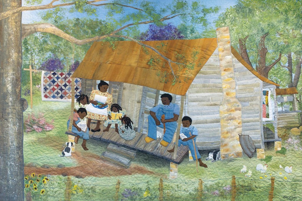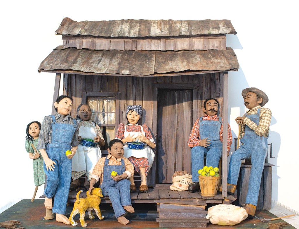 Born in 1935 in rural Georgia, Amos helped her mother hand sew quilts as a child. In 1959, she moved to Clarksville when her husband was deployed to Vietnam. She devoted her days to raising her three children and being involved in the community. It was there in Clarksville that her sculpting began forty years ago when she decided she needed art to fill her walls. She attempted to make Christmas tree ornaments out of Styrofoam and fabric but was dissatisfied. She continued to experiment and finally discovered polymer clay, which she molded into realistic figures. As a fabric artist, Amos’s quilts show farm scenes, families on porches reading, shelling peas, and carving wood. Her quilts are highly detailed with carefully chosen color combinations.
