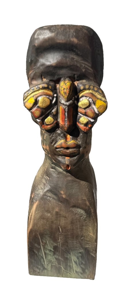In the recent years I’ve taken wood sculpting under my belt, and have connected my ancestors and lineage of black Memphis sculptors as my biggest inspiration. Benin Bronzes have drawn me to creating masks of similar appearance but only through wood work, and a burning technique. I’m able to convey a strong African style, while still allowing my own artistic style to shine through. I also paint with Oils, and I use this medium because of the range of ways to manipulate the paint, whether that be texture, scraping, thinning, layering, etc. Living in a church I’ve come to be very familiar with the bible and liturgical seasons, these themes have found a cozy place in my work, sometimes it shows itself through iconography, some more subtle, such as religious poses, or sacred objects. I tie all of my experiences through my youth of discovering my sexuality, and trying my best to concentrate on what it means to be a black man in America. My work encapsulates all of these ideas, heavy handed or not. I hope my viewers regardless of their identity can relate and find their own selves within the works.