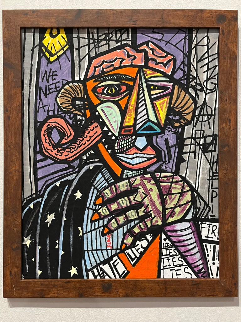 His art elicits energy by using bright colors surrounded by bold black lines. Since the beginning, he has used painting as therapy to direct grief into movement, thoughtfulness and to hold a mirror up to society. He is influenced by the work of many artists including Barry McGhee, Margaret Kilgallen✝, Ed Roth✝, Genndy Tartakovsky, Keith Haring✝ & Jean-Michel Basquiat✝.