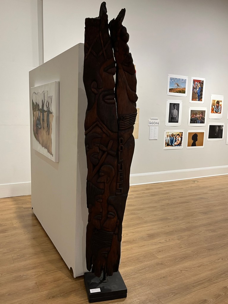 Abstract expressions represent comments on issues, events, and beliefs. Subjects include ethnicity, blues, protest, morality, spirituality, justice, hate, freedom, gentrification, black church, racism, and other realities. The process involves transferring an idea, thought, or concept from mind to hand and chisel and onto the wood. A dance occurs between me and the wood. We become one. The wood that once lived lives again when the work is finished. The wood tells a story.